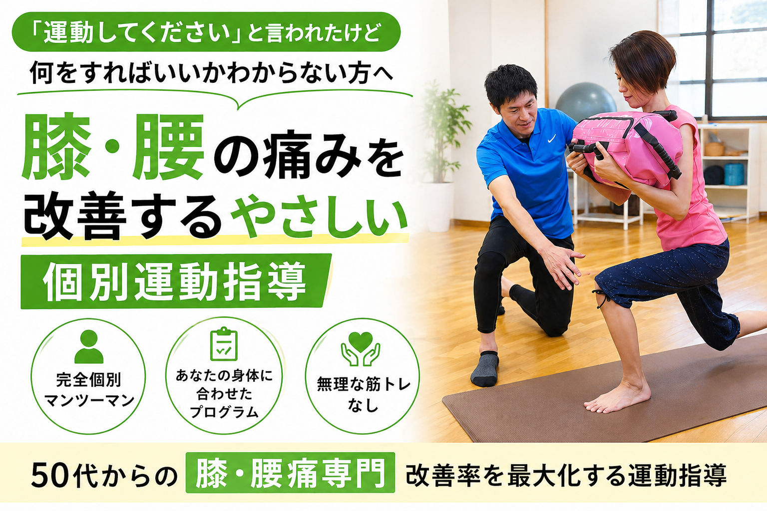 腰痛、膝痛、痛みは同じようでも原因は人によって様々、300種類以上の種目からあなたの体に必要であなたの体に合ったオンリーワンプログラムを実施